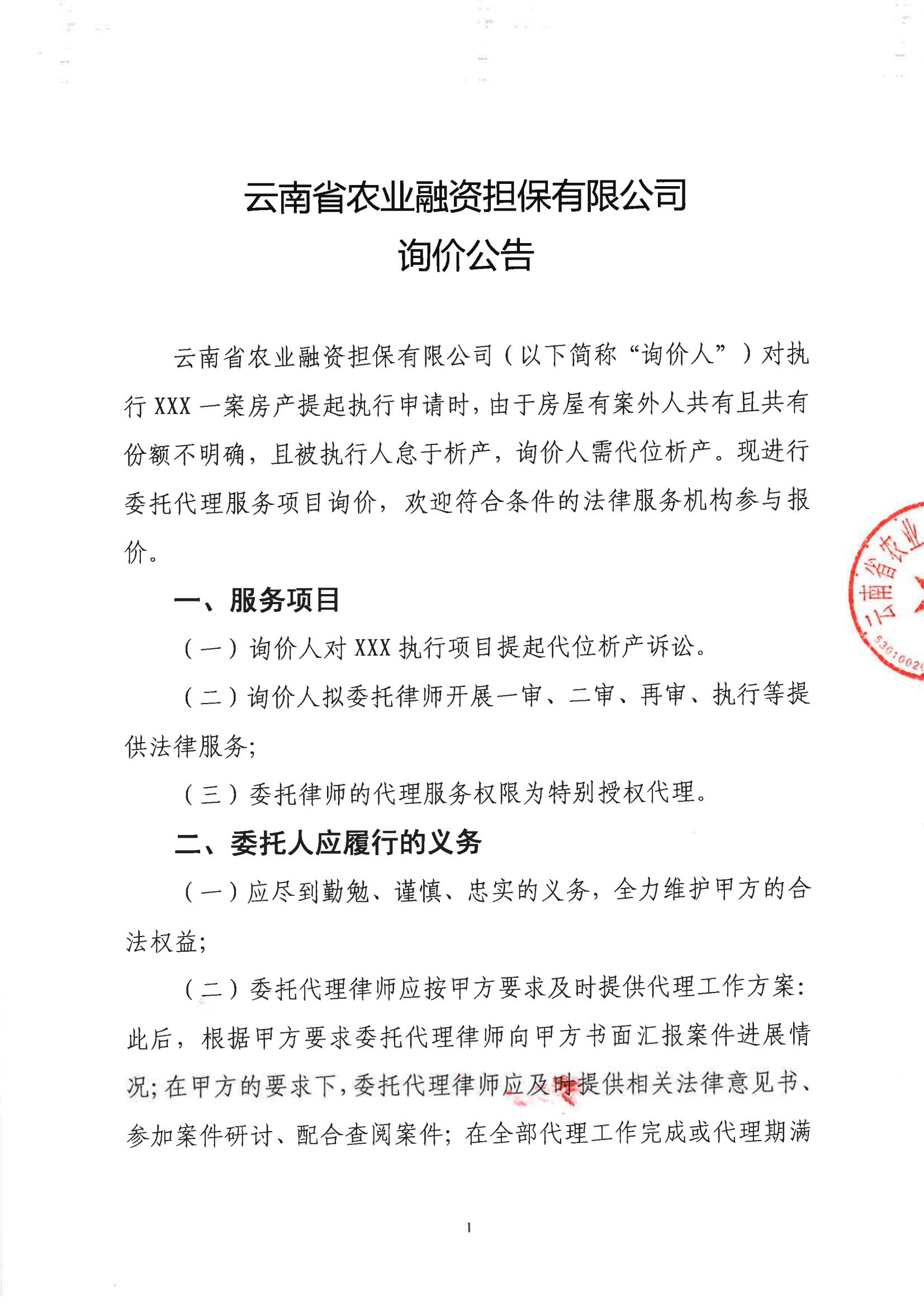 云南省農(nóng)業(yè)融資擔(dān)保有限公司詢價(jià)公告