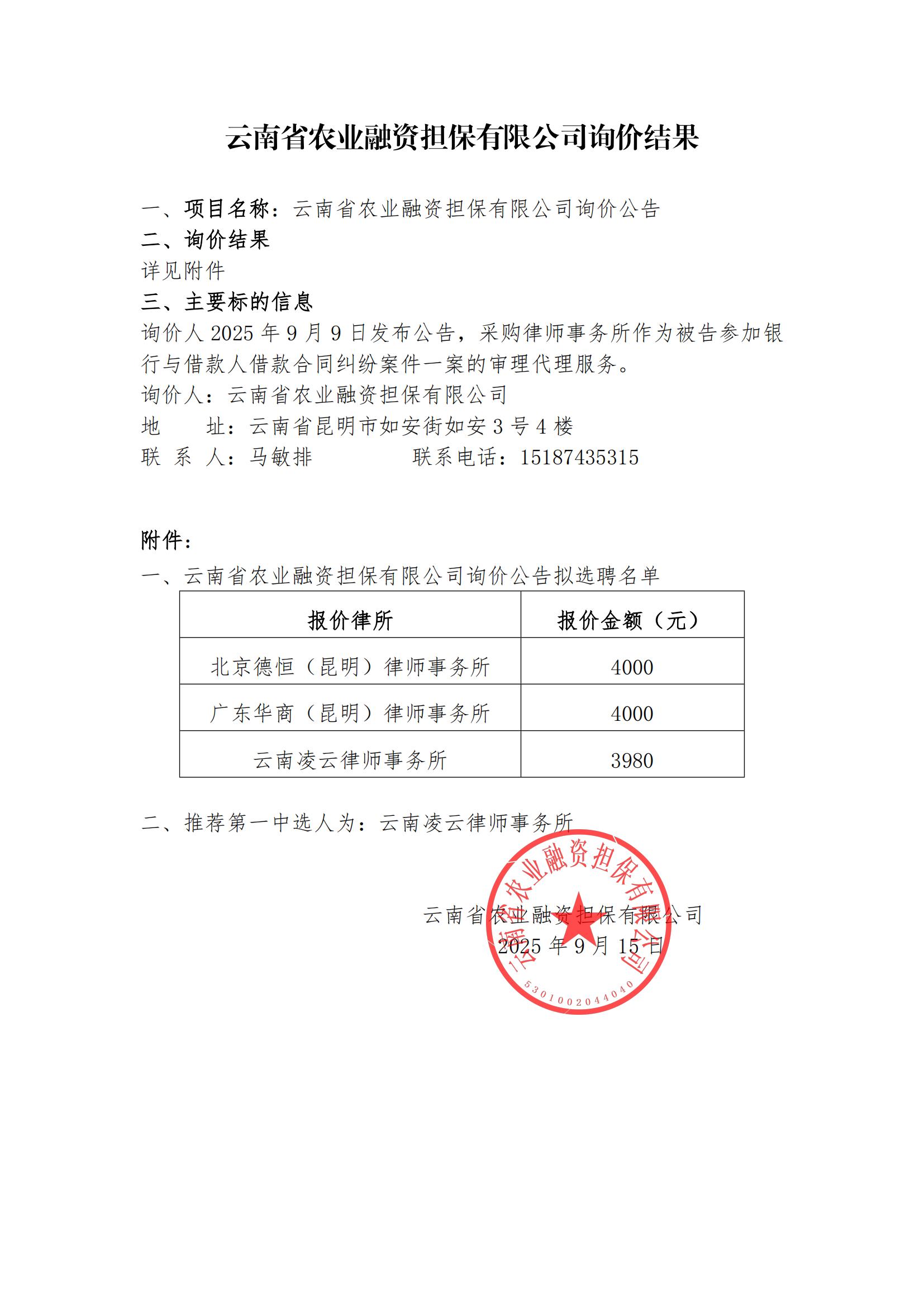 云南省農(nóng)業(yè)融資擔(dān)保有限公司詢價(jià)結(jié)果