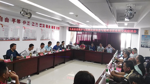8月29日馬來西亞維護(hù)與發(fā)展協(xié)會會長、皇室拿督蔡振行博士一行27人到昆明市農(nóng)業(yè)局開展農(nóng)業(yè)交流,市農(nóng)業(yè)局倪淼副局長、局辦公室、人事處、種植業(yè)處、畜牧處、市場信息處、質(zhì)監(jiān)處等相關(guān)處室人員參加座談會。