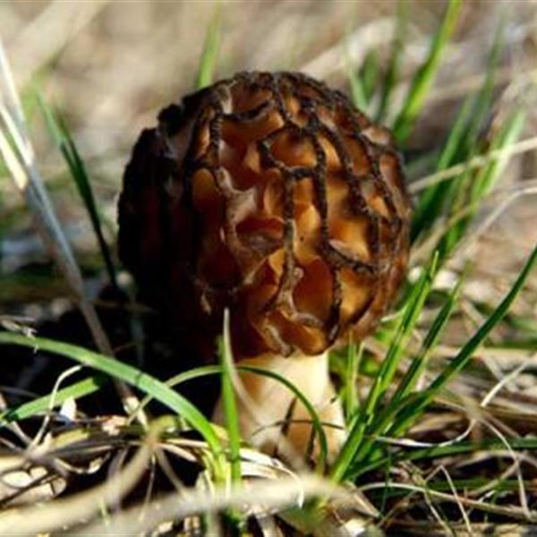 黑色遮陰網(wǎng)下,密密麻麻的菌床上長滿了成熟的羊肚菌。